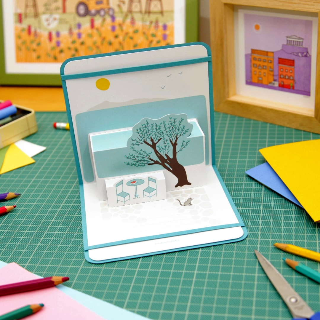 Elegant yet playful, this pop up card is inspired by summer everyday life in Greece.