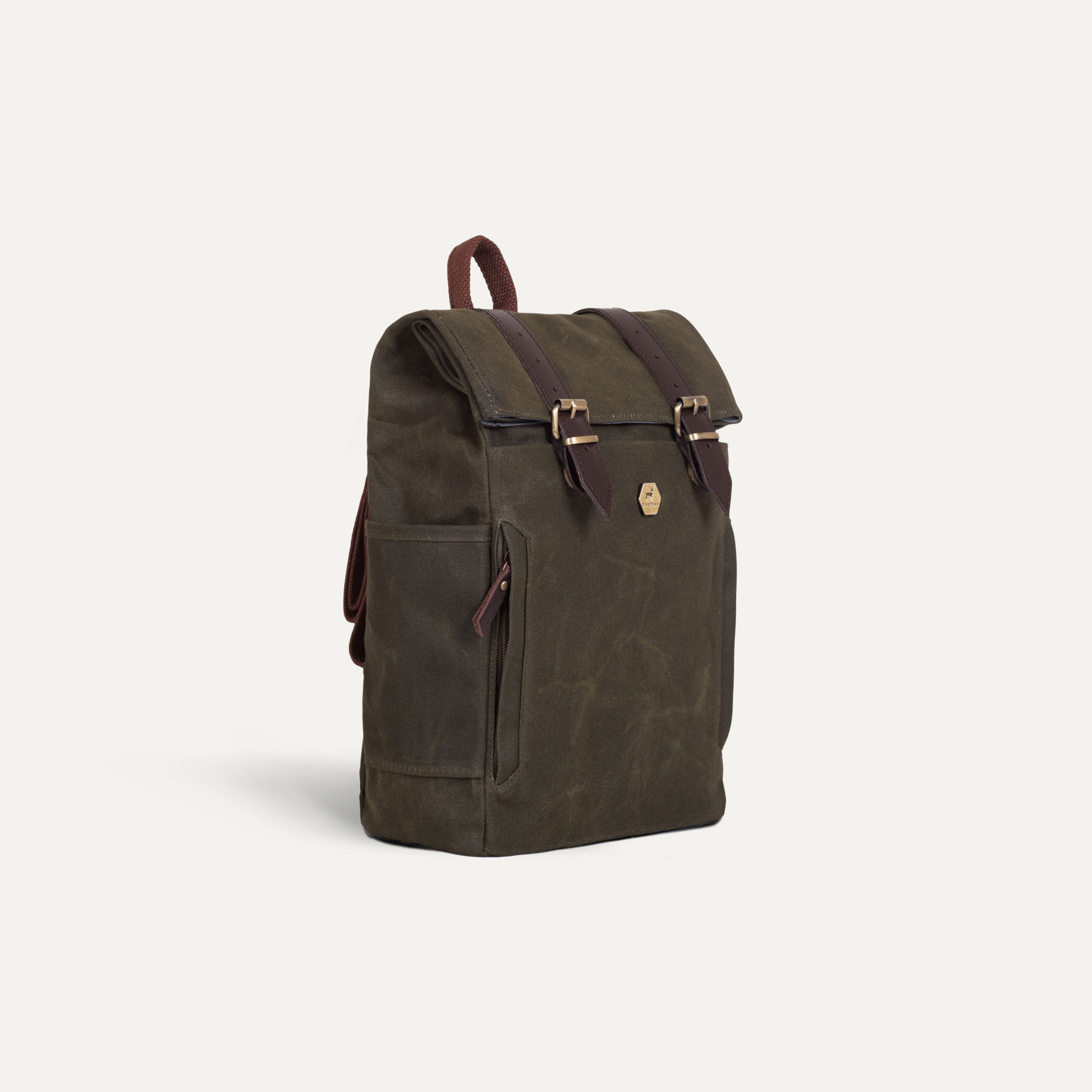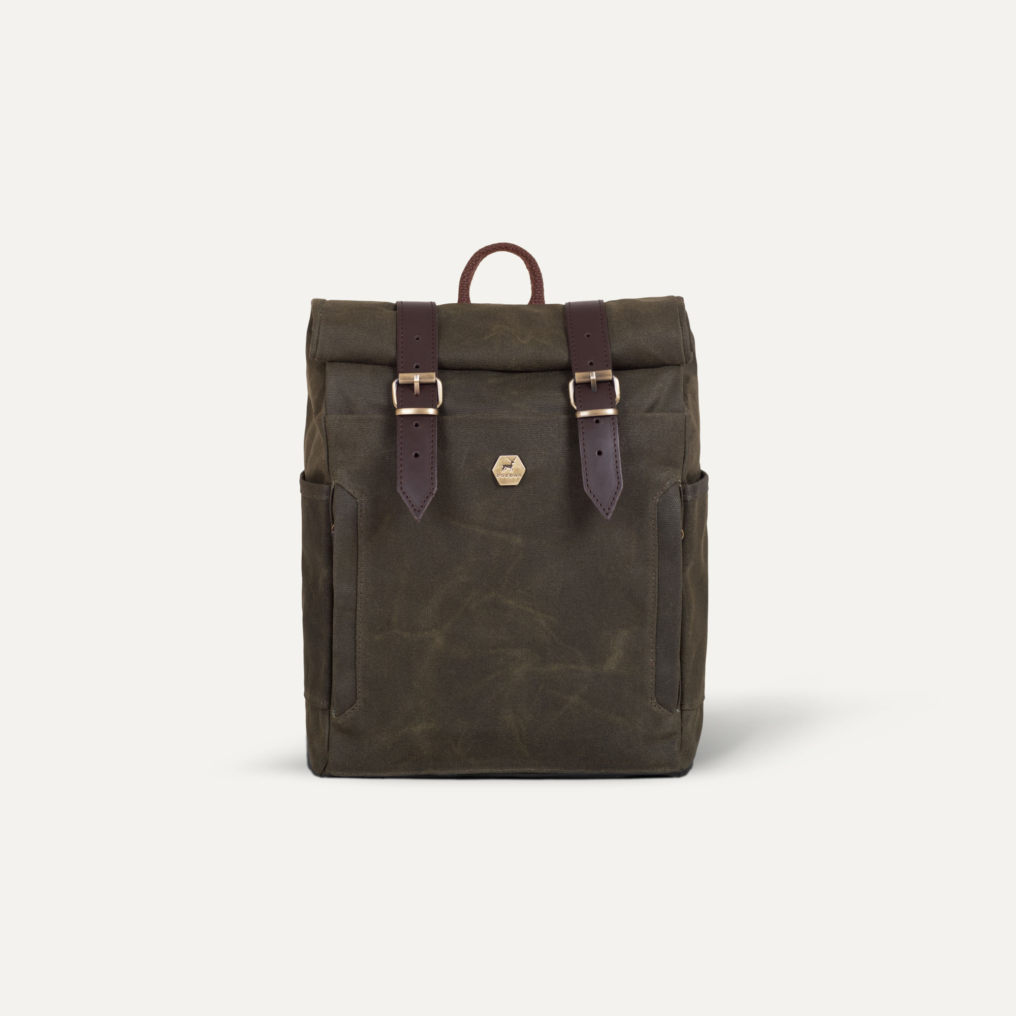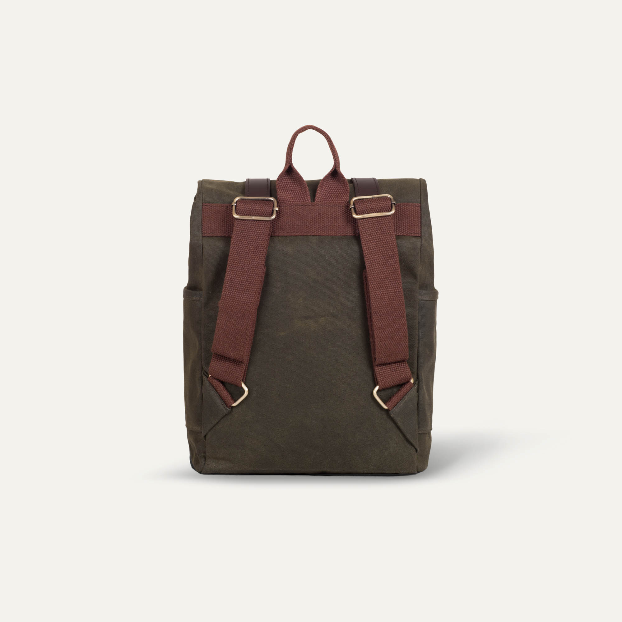 A waxed waterproof cotton canvas backpack with cotton lining. It’s made in Serres by Burban Bags.