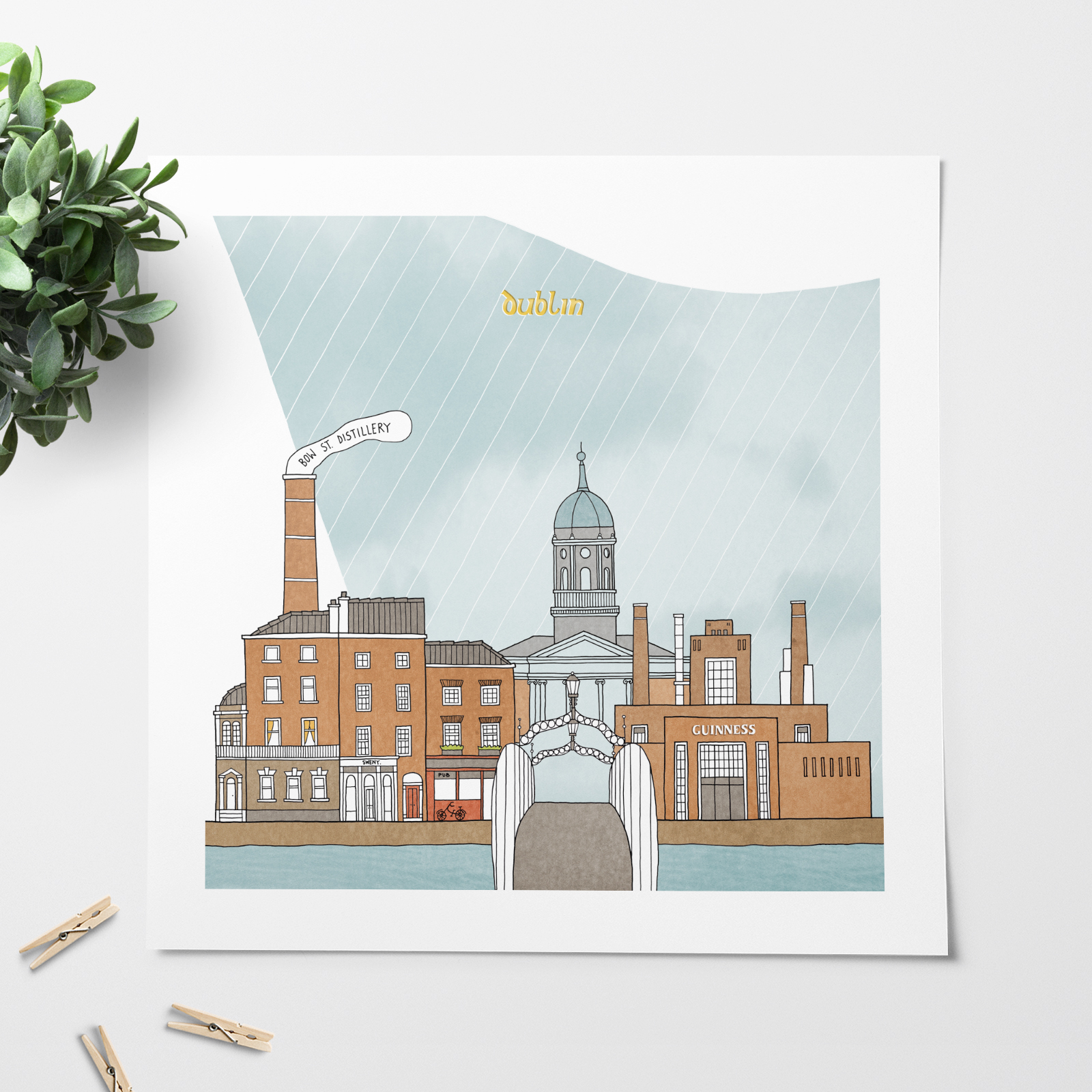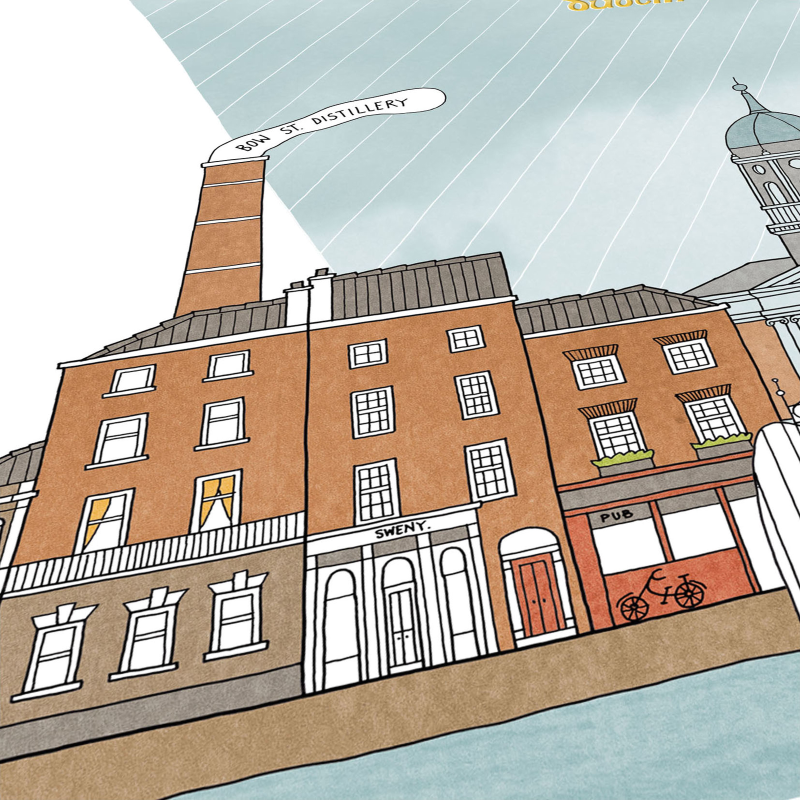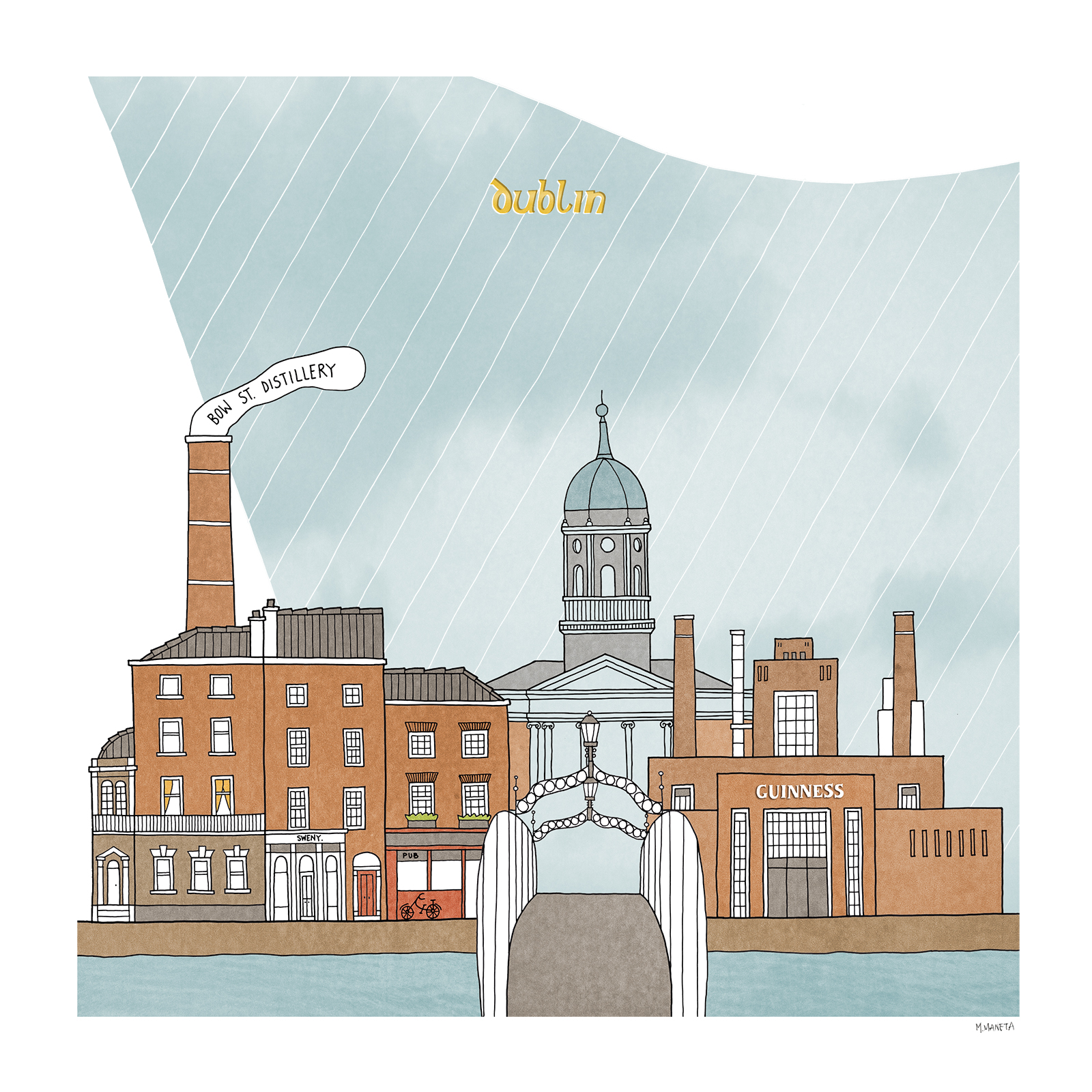 This is a reproduction of an original illustration of Dublin, hand drawn in pen, digitally colored.