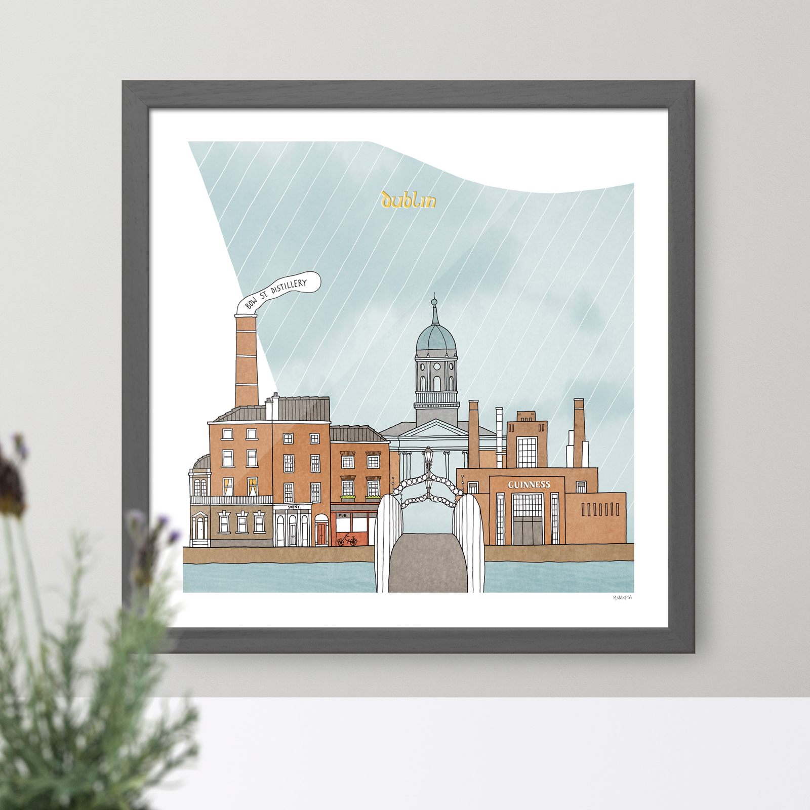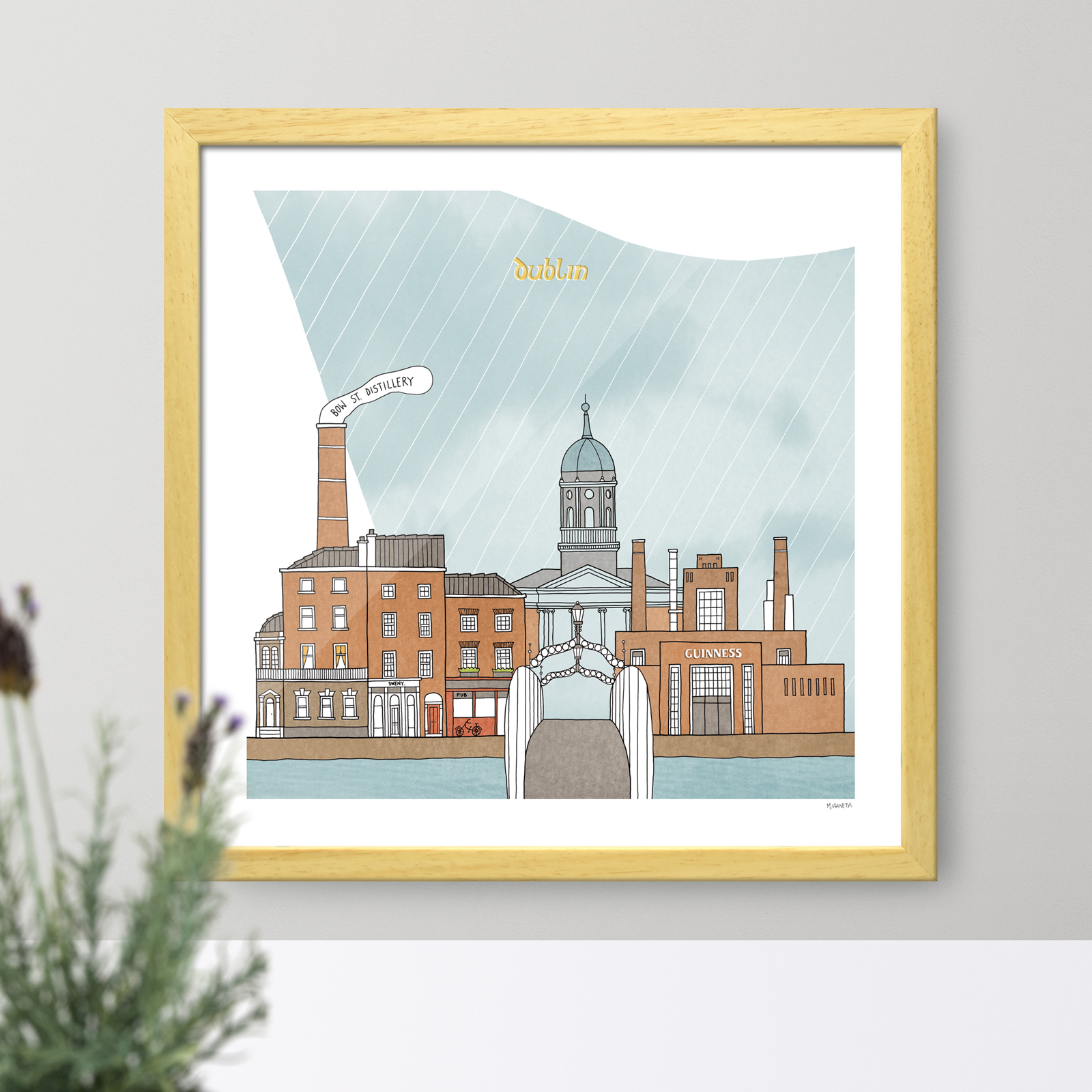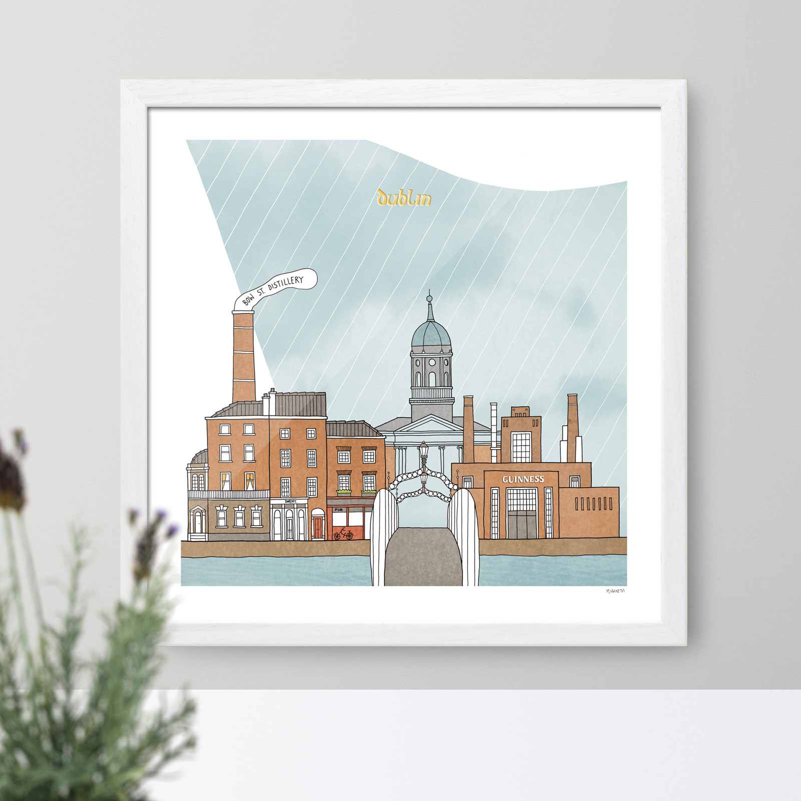 This is a reproduction of an original illustration of Dublin, hand drawn in pen, digitally colored.