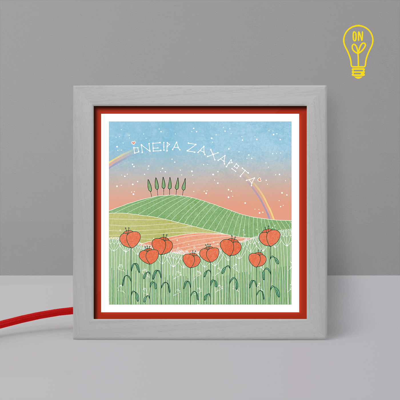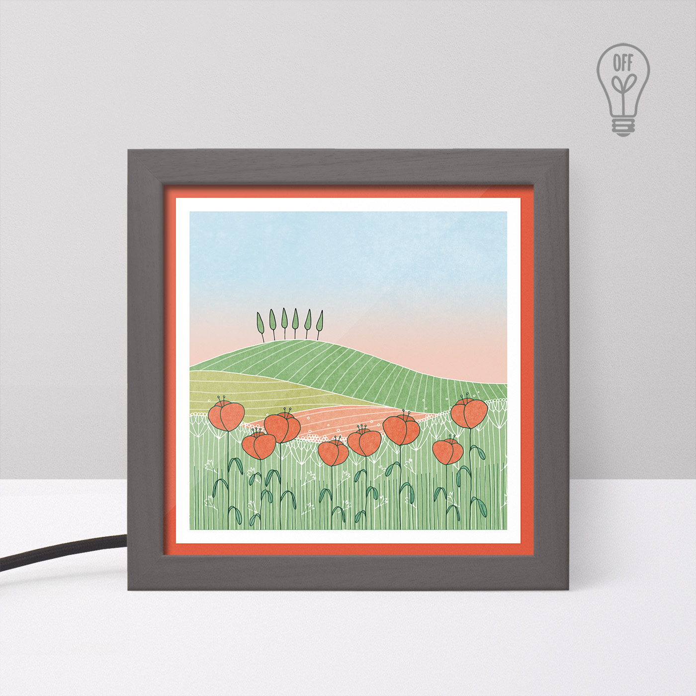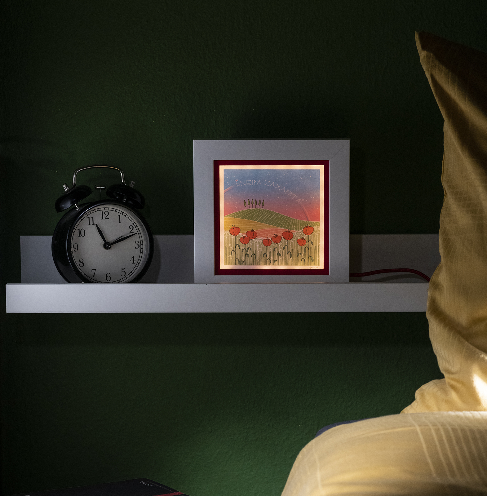 - Wall hanging / table light box with two complementary illustrations alternating when lights turn on and off