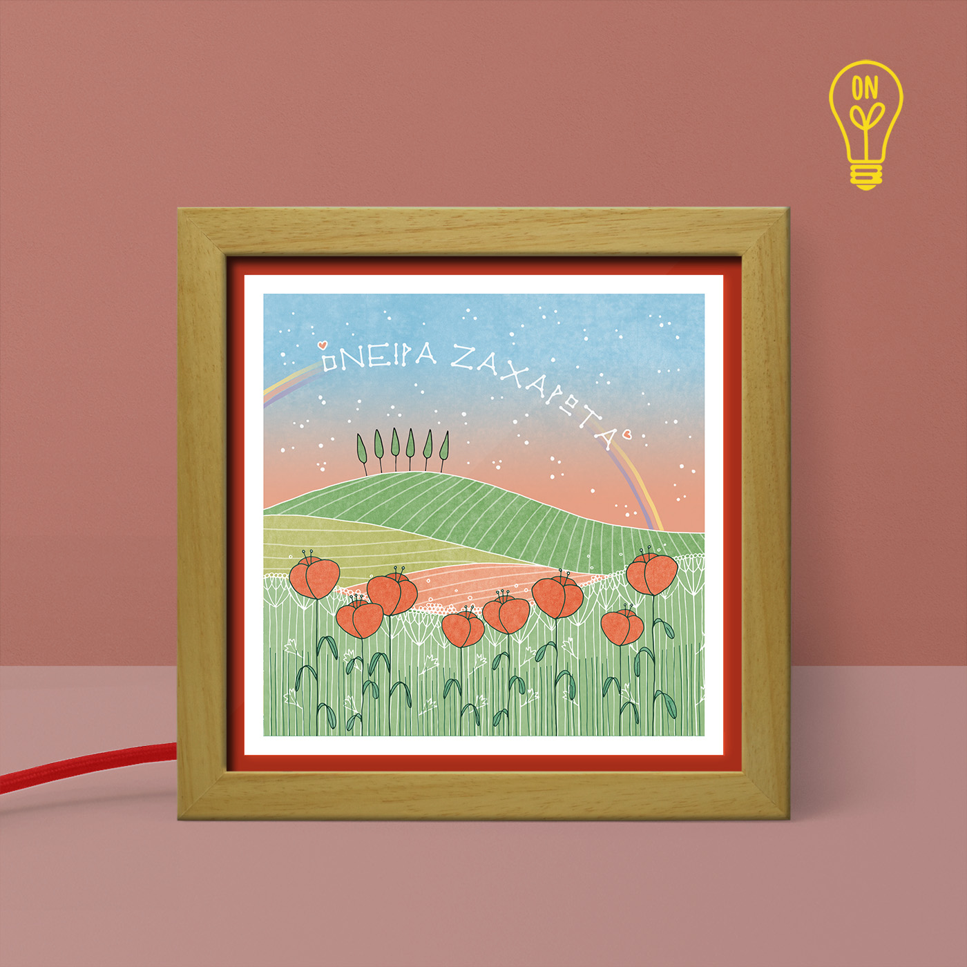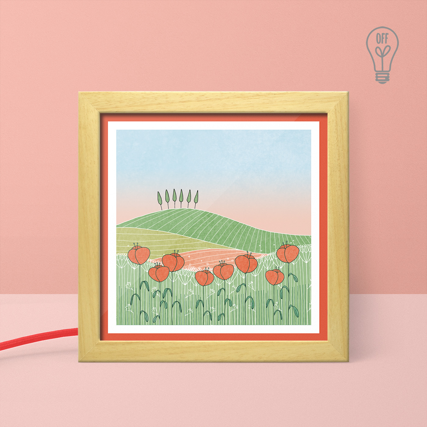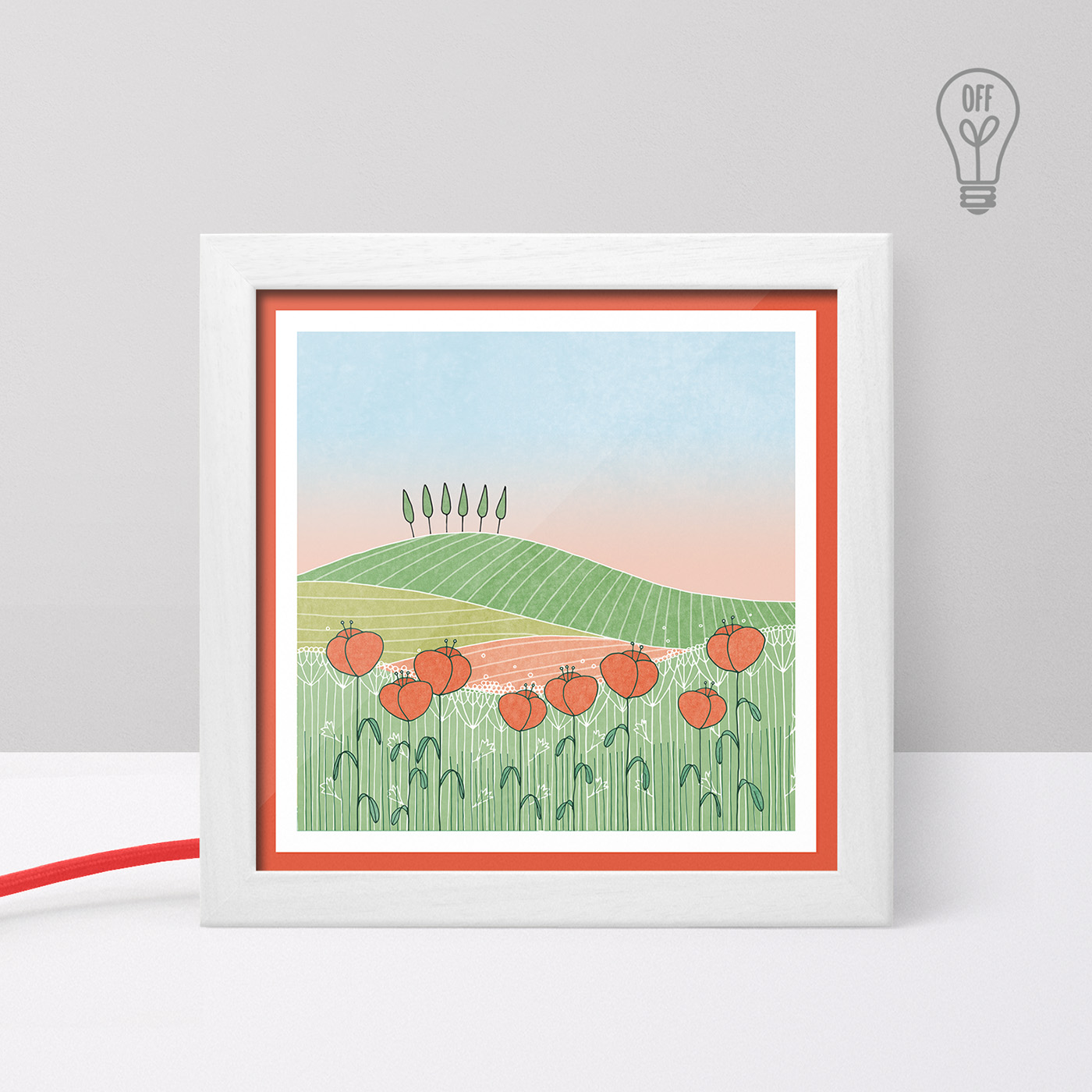 - Wall hanging / table light box with two complementary illustrations alternating when lights turn on and off